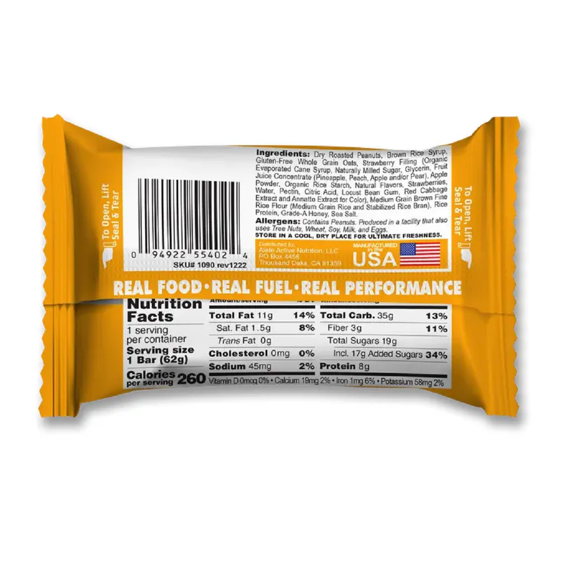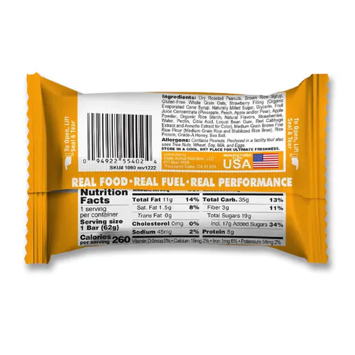 INGREDIENTS: Dry Roasted Peanuts, Brown Rice Syrup, Gluten-Free Whole Grain Oats, Strawberry Filling (Organic Evaporated Cane Syrup, Naturally Milled Sugar, Glycerin, Fruit Juice Concentrate (Pineapple, Peach, Apple and/or Pear), Apple Powder, Organic Rice Starch, Natural Flavors, Strawberries, Water, Pectin, Citric Acid, Locust Bean Gum, Red Cabbage Extract and Annatto Extract for Color), Medium Grain Brown Fine Rice Flour (Medium Grain Rice and Stabilized Rice Bran), Rice Protein, Honey, Sea Salt.
