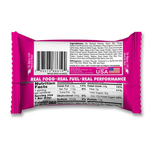 • 260 Calories per Bar • 33 g of Carbohydrate • 11 g of Plant-Based Protein • 3:1 Carbs-to-Protein Ratio (optimal for recovery) • First ingredient is Dry Roasted Peanuts • Plant-Based (contains honey) • Certified Gluten-Free • Dairy Free • No Artificial Ingredients or Colors • Manufactured in the USA • Contains Peanuts. Produced in a facility that also uses Tree Nuts, Wheat, Soy, Milk, and Eggs.