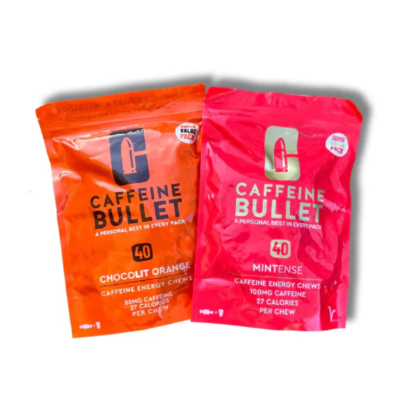 Each Chocolate Orange Caffeine Chew contains 85mg caffeine (a strong cup of coffee) and kicks faster than energy gels.