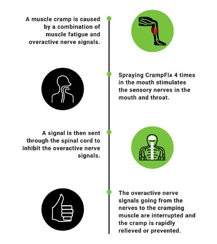 CrampFix® treats muscle cramps through the neuro-muscular system. Instead of treating the cramping muscle itself as most commonly done, CrampFix® treats the OVERACTIVE NERVES that are causing the muscles to cramp.