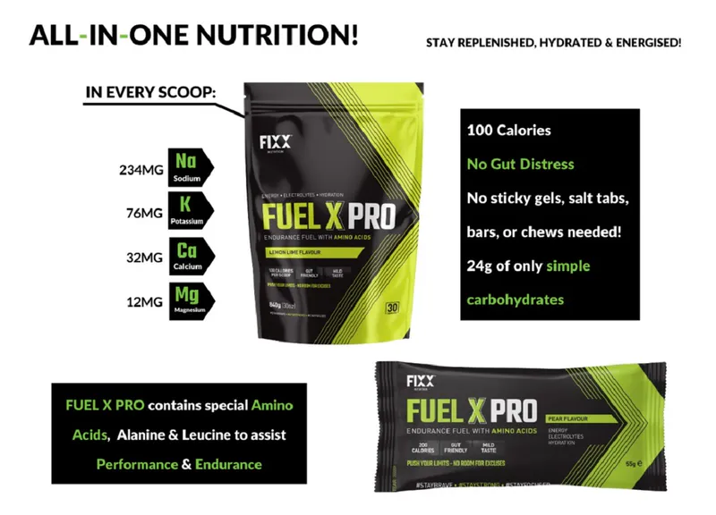 The ELECTROLYTES in Fuel X are formulated to replace everything you lose during exercise. No sticky bars, chews or gels needed! Fuel X Pro is a superior source of nutrition as it also contains premium amino acids for improved performance and endurance.