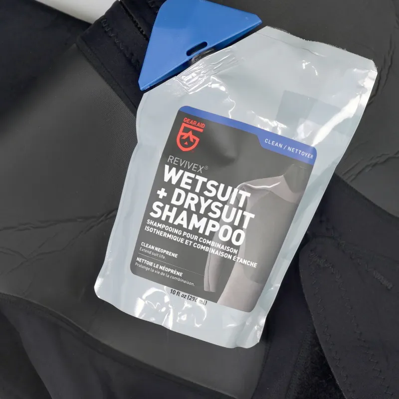 Revivex Wetsuit and Drysuit Shampoo extends life of neoprene gear. Removes residues, particles and salt without damaging it. 2-in-1 formula cleans and conditions, preventing premature aging. Use one 10 fl oz pouch for 10 wash treatments. Safe for wetsuits, drysuits, triathlon suits, life jackets, fishing waders, booties, and gloves.