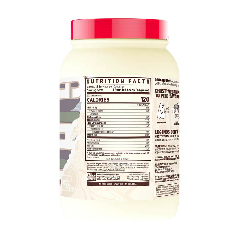 GHOST Vegan Protein was conceived to feed savagery around the clock: breakfast, post workout, throughout the day or before bed. Ghost Vegan Protein is versatile and can be used in smoothies, protein ice cream, oats, pancakes, and baked goods. This formula provides 20 g protein per serving derived from 80% Pea Protein Concentrate, 70% Organic Pumpkin Protein, and 75% Watermelon Seed Protein.