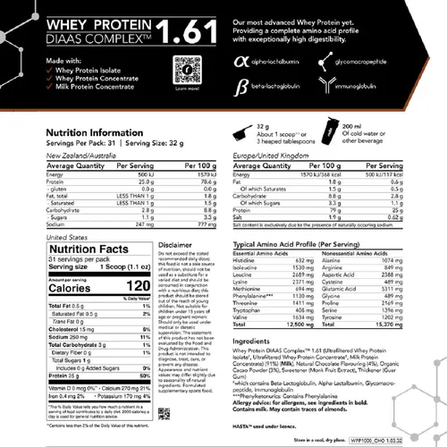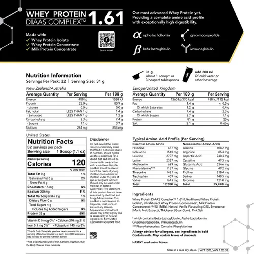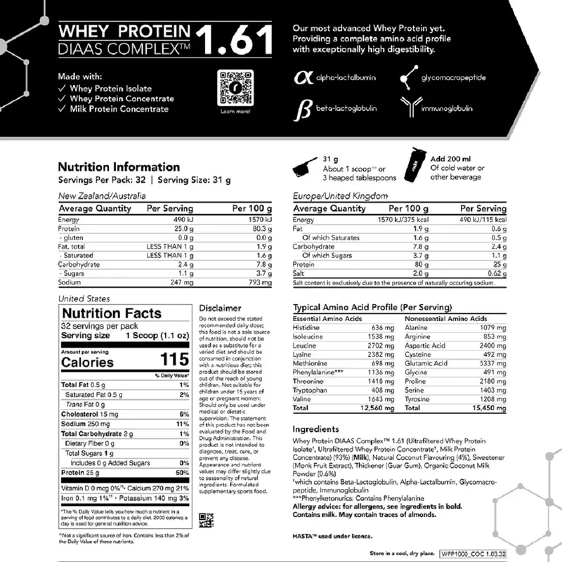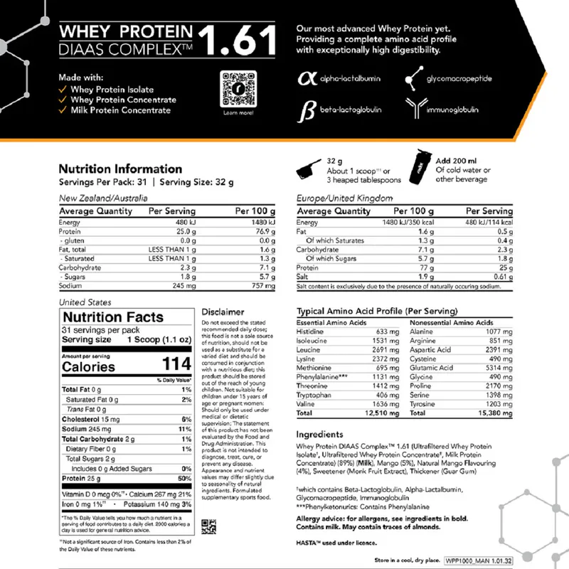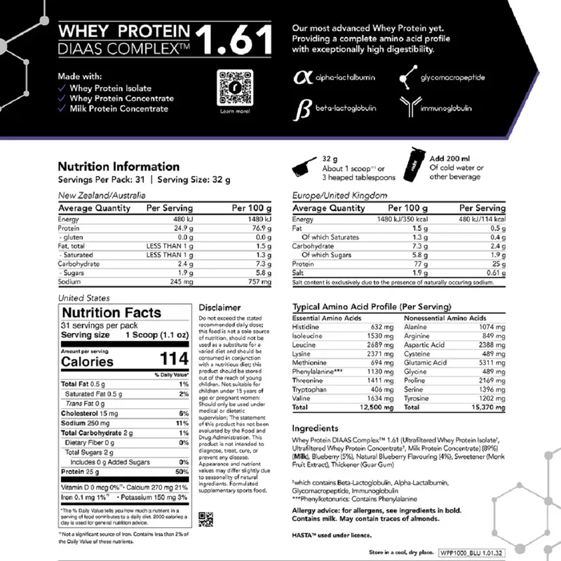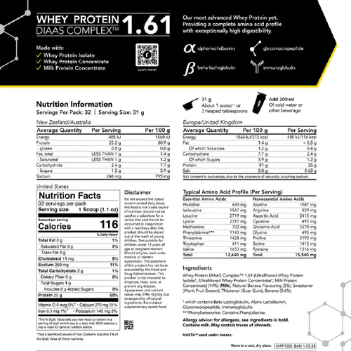 Whey Protein DIAAS Complex 1.61 leverages the Digestible Indispensable Amino Acid Score (DIAAS) scientific method for measuring protein quality to maximise bioavailability and deliver an unmatched amino acid profile. This allows you to experience faster recovery, increased muscle growth, and improved overall health and performance.