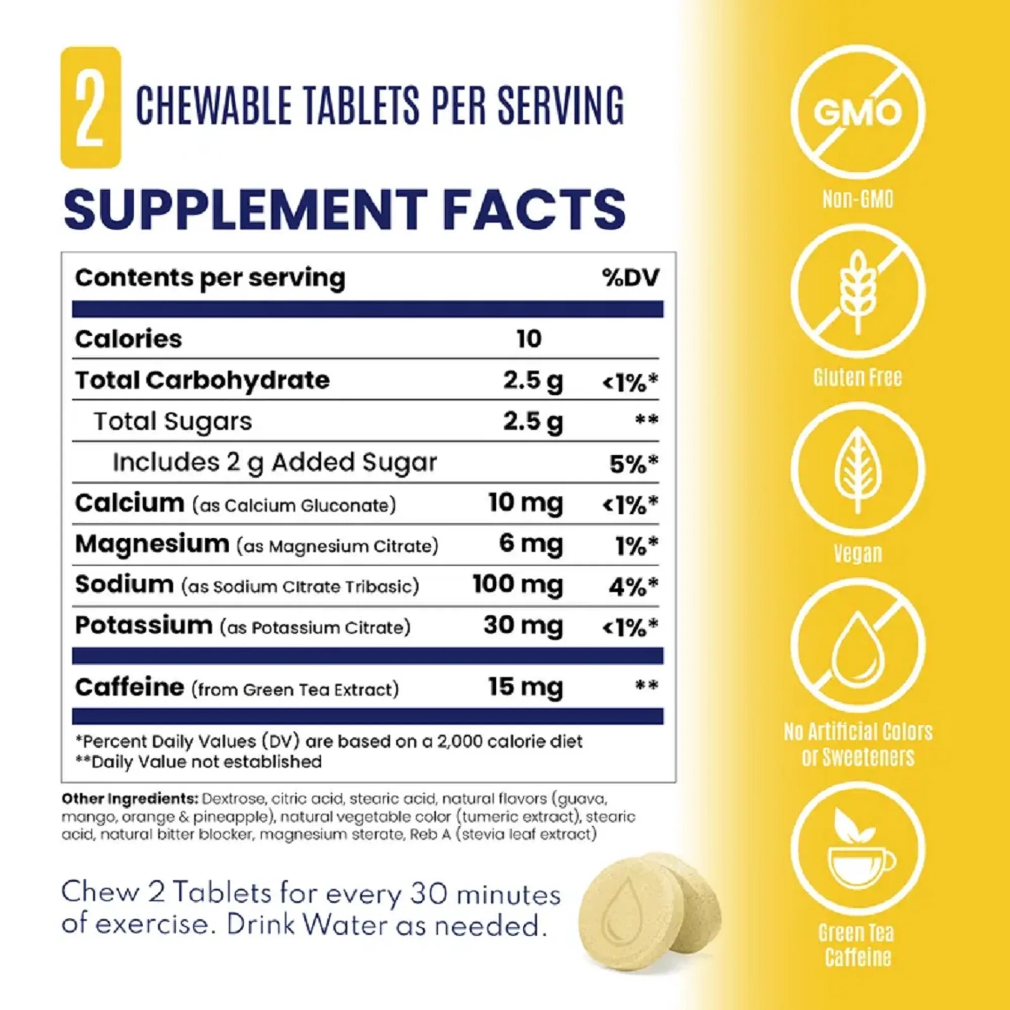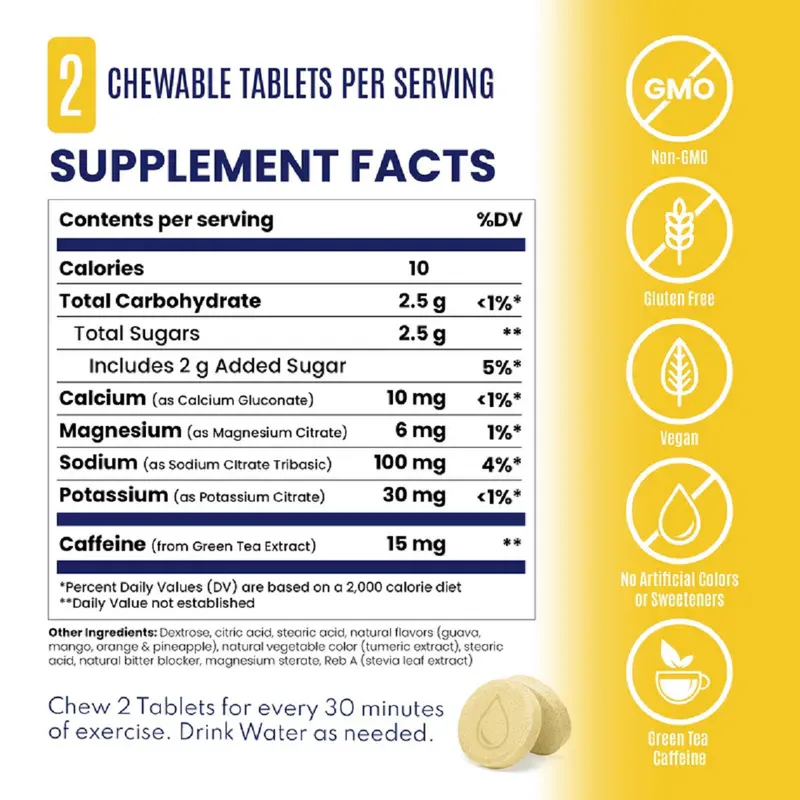 SUGGESTED USE: Chew 2 tablets for every 30 minutes of exercise. For maximum effect, chew completely before swallowing. Drink water as needed.