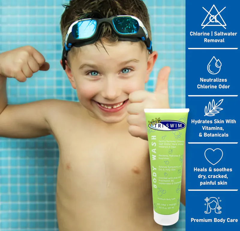 TRISWIM’S Kids Chlorine Out Body Wash contains Organic Aloe Vera which moisturizes and helps protect from environmental elements. TRISWIM Kids Swimmers Body Wash eliminates the dry itchy feeling, soothing dry skin by completely and effectively eliminating Chlorine, Bromine, hard water minerals, salt water and chemical odor while re-hydrating the skin.