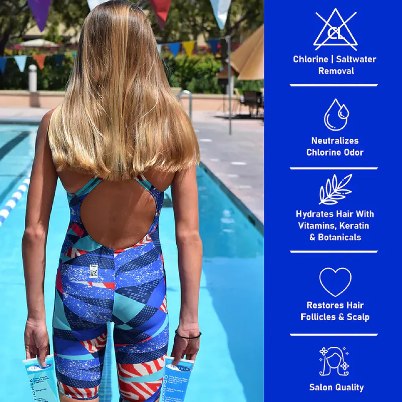 - Removes chlorine, bromine, hardwater minerals, associated odors, & saltwater from hair.