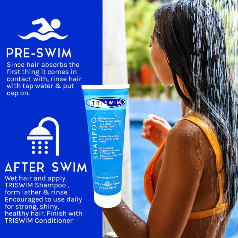 TRISWIM Chlorine Removal Shampoo dual-action gently removes unwanted chlorine, bromine, saltwater, hard water minerals, associated odors, and green tint from your hair while moisturizing with Aloe Vera, Pro-Vitamin B5, Chamomile & Watercress. The fresh tropical Lime + Tropical Mango scent will invigorate your senses!