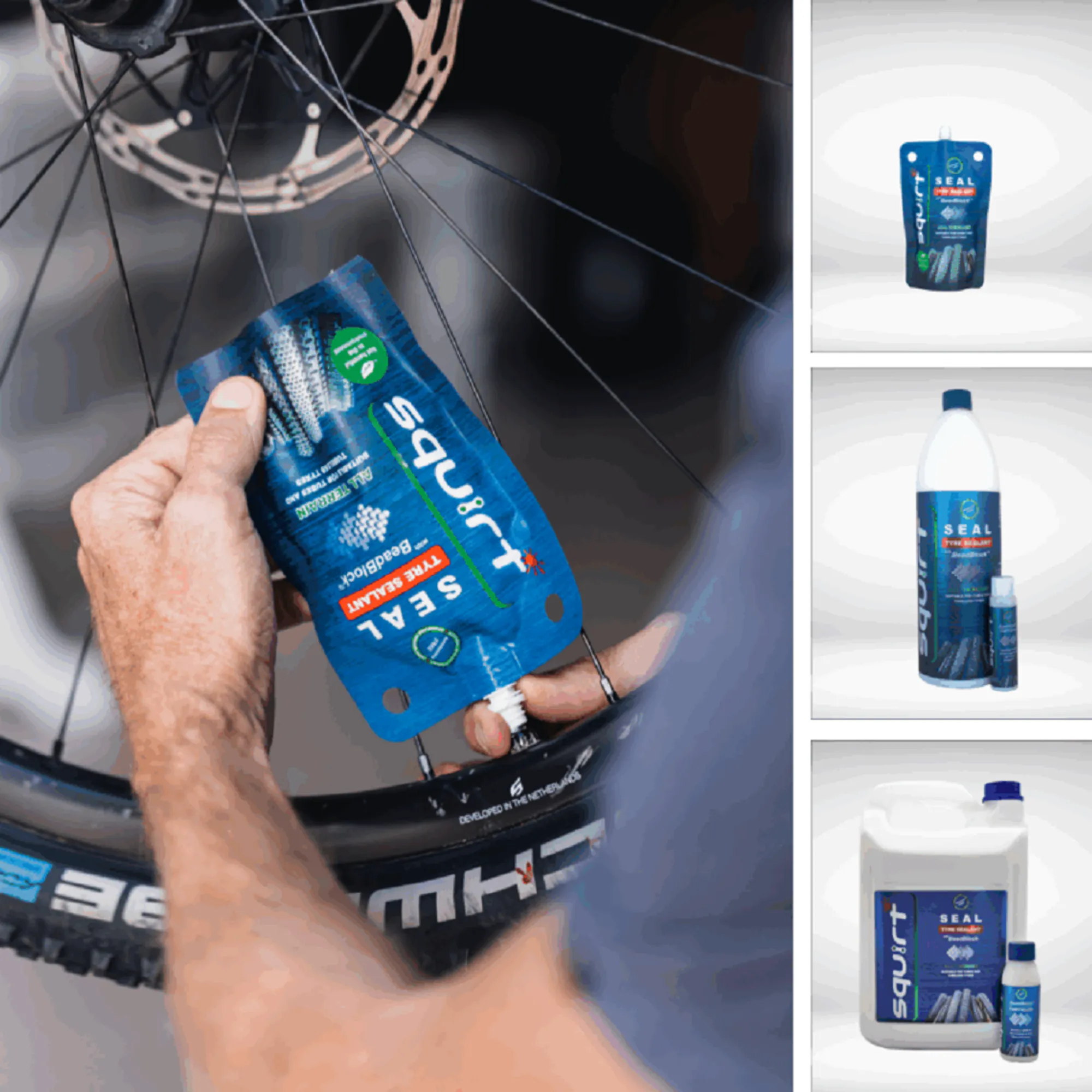 Squirt SEAL with BeadBlock is an ammonia-free latex solution which contains natural microfibres and BeadBlock particles. Together they form a permanent, reinforced rubber plug in punctures caused by objects of up to 6mm. It will prevent sidewalls sticking together. Contains corrosion inhibitors. Suitable for use from -20 °C to +40 °C.
